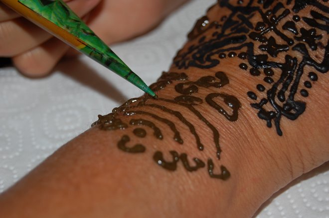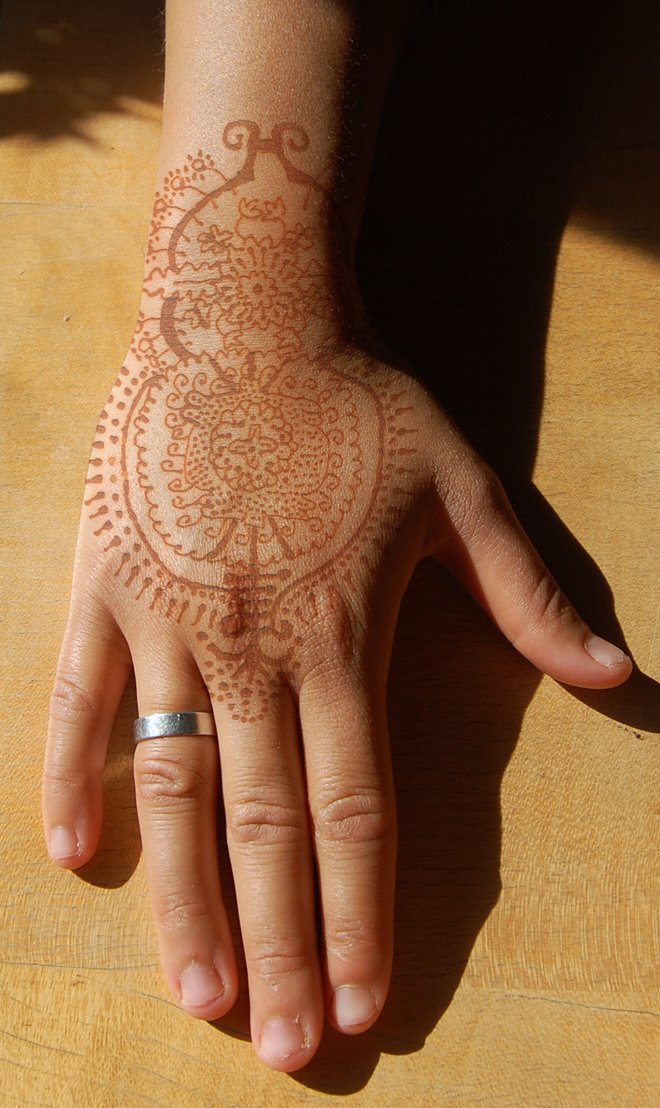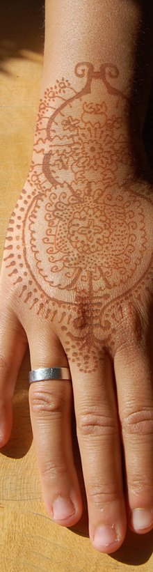 Henna als natürliches Färbemittel wird traditionell in detailreichen und verspielten Mustern auf Hände unf Füsse aufgetragen, nach genau dem selben Verfahren wie es bereits vor über 9000 Jahren zur Verehrung von weiblichen Gottheiten verwendet wurde.